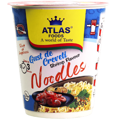 نودلز فورية بنكهة القريدس بكوب جاهز خلال حوالي 3 دقائق، خيار ممتاز لوجبة سريعة وسهلة التحضير.
