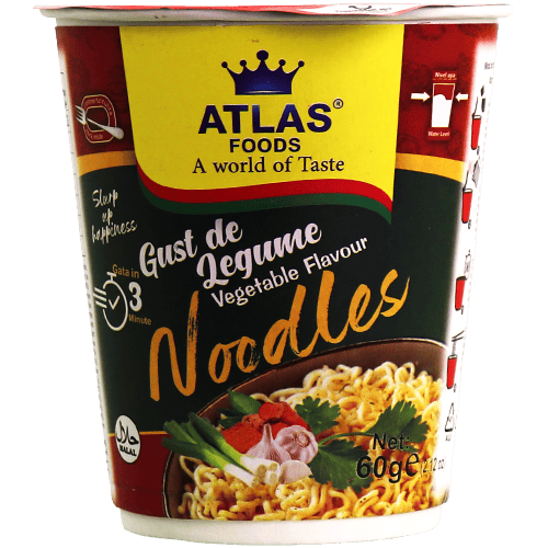 نودلز كوب بنكهة الخضار من أطلس فود، جاهزة خلال حوالي 3 دقائق—بس أضف مي ساخنة، اتركها، حرّك وكُل.