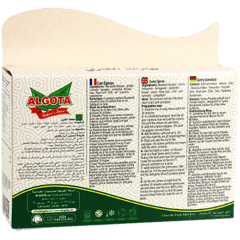 المكونات الأساسية (كما في العبوة وخلطات الكاري المشابهة): كركم، كزبرة، كمون، حلبة، فلفل أسود، زنجبيل، شطة وتوابل طبيعية أخرى.