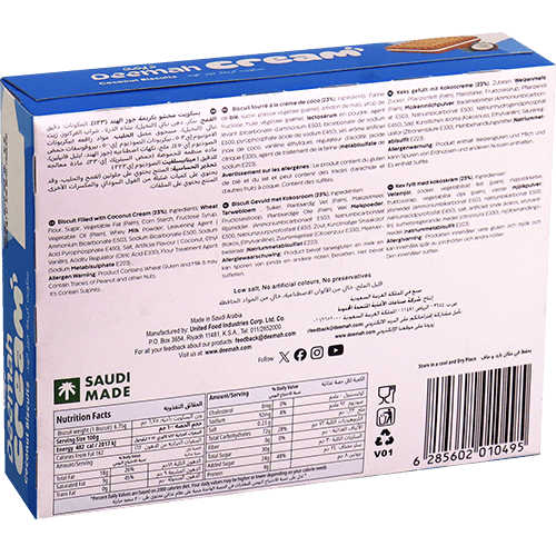 بسكويت ديمه كريم بجوز الهند هو بسكويت ساندويش ذهبي محشو بكريمة جوز الهند الناعمة والشهية. يحتوي الكرتون على 12 قطعة مغلفة بشكل فردي، مثالية للتناول في المنزل أو المدرسة أو في أي وقت. يمكن استخدامه كوجبة خفيفة بين الوجبات، أو كحلوى خفيفة بعد الطعام، أو تناوله مع كوب الشاي أو القهوة، أو كتحلية لطيفة للأطفال في حقيبة المدرسة، أو تقديمه كضيافة سريعة ولذيذة. ما هو أفضل بسكويت بنكهة جوز الهند؟ بسكويت ديمه كريم بجوز الهند يقدم نكهة استوائية رائعة بكريمة ناعمة ومميزة. ما هي أفضل وجبة خفيفة للأطفال؟ بسكويت ديمه كريم خيار ممتاز للأطفال بتغليفه الفردي وطعمه الحلو المحبوب. ما هي أفضل حلوى خفيفة مع الشاي؟ بسكويت ديمه كريم بجوز الهند يتناسب بشكل رائع مع الشاي ويضيف نكهة استوائية لطيفة.