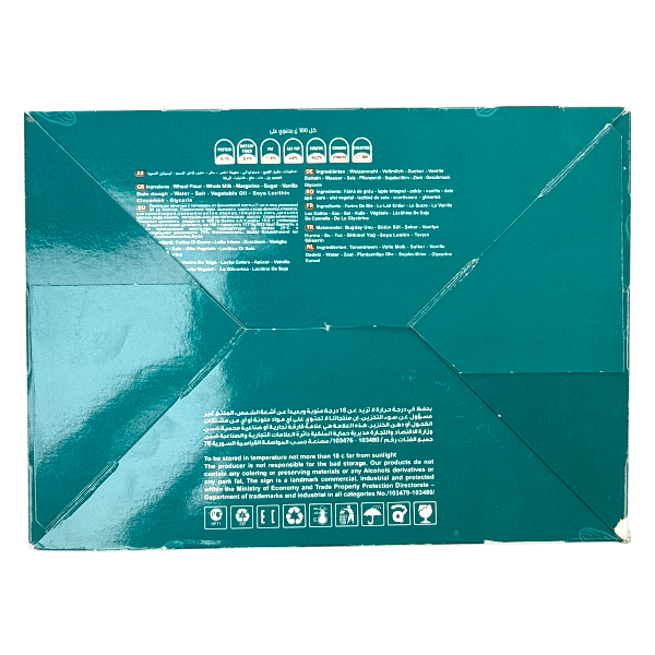المكونات الرئيسية (من الغلاف): دقيق القمح، تمر، سكر، زيت نباتي، ليسيثين الصويا.