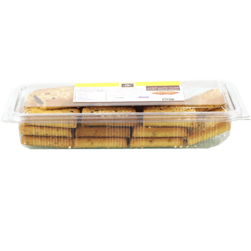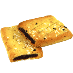 بسكويت كليجا مقرمش محشو بعجوة التمر، مزين بحبات السمسم الأبيض والأسود ليمنح طعماً غنياً وقواماً هشاً يناسب الضيافة أو الوجبات الخفيفة.