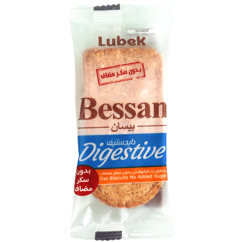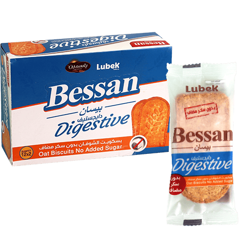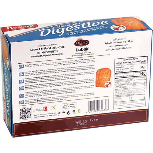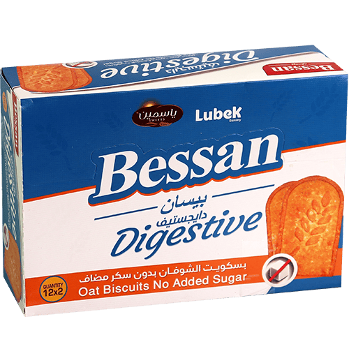 بسكويت دايجستف بالشوفان بدون سكر مضاف، مقرمش ومقسم إلى 12 باكيتات داخلية (كل باكيت قطعتين) مناسب للدوام/المدرسة وللتسالي الخفيفة.