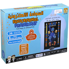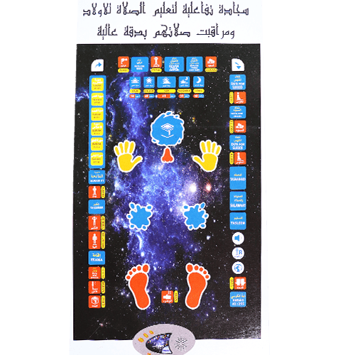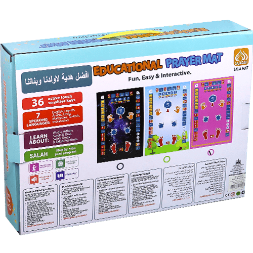 سجادة صلاة تفاعلية وتعليمية للأطفال من ماركة سالا مات. تحتوي على 36 زر لمس تدعم 7 لغات، وتعلم الأطفال خطوات الصلاة والمعارف الدينية من خلال الصوت والضوء. مصنوعة من قماش ناعم جداً وحساسات عالية الجودة. المكونات الأساسية: قماش ناعم جداً، حساسيات إلكترونية.