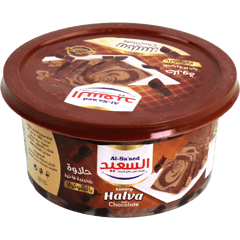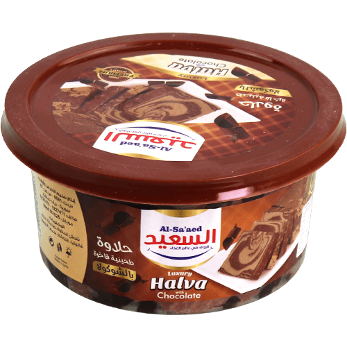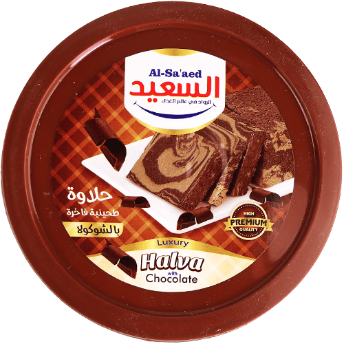 حلاوة فاخرة بالشوكولاتة مصنوعة من الطحينة ورقائق الشوكولاتة الغنية. جودة فاخرة بقوام ناعم وكريمي ونكهة شوكولاتة مكثفة. حلوى شرقية تقليدية مثالية كحلى أو وجبة خفيفة. مصنوعة من مكونات طبيعية تشمل طحينة السمسم والسكر والشوكولاتة.