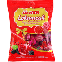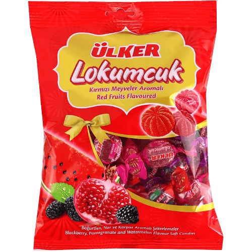 حلوى تركية طرية بقوام لوكوم خفيف ونكهات الفواكه الحمراء (توت أسود، رمان، بطيخ)، مغلفة حبة حبة ومناسبة للضيافة.