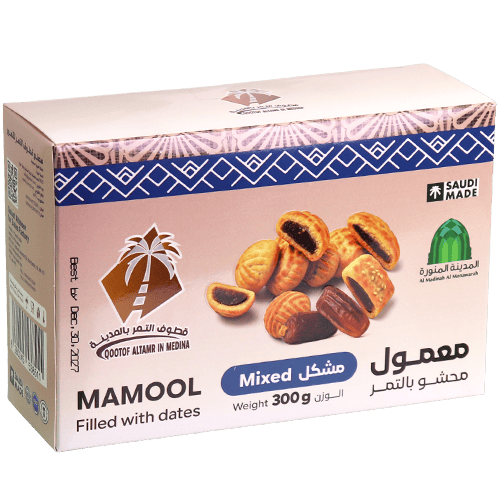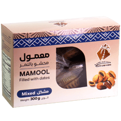 معمول سعودي محشو بالتمر (مشكل) ضمن علبة 300غ، قطع بأشكال متنوعة مناسبة للضيافة مع القهوة العربية أو الشاي.