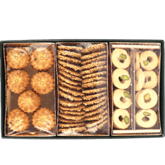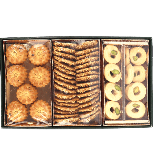 س: شو الأنواع الموجودة عادة داخل العلبة؟ ج: غالباً معمول تمر + برازق سمسم + غريبة (وقد تكون بعض القطع مزينة بالفستق).