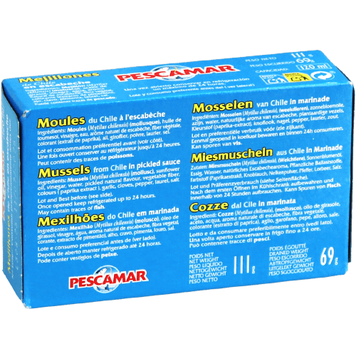 محار تشيلي فاخر محفوظ في صلصة مخللة لذيذة. طعام بحري شهي جاهز للأكل، مثالي كمقبلات أو تاباس. المكونات الرئيسية: محار، ماء، خل، ملح، بهارات، فلفل حلو.