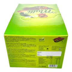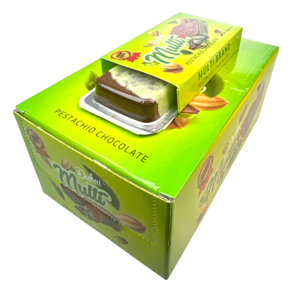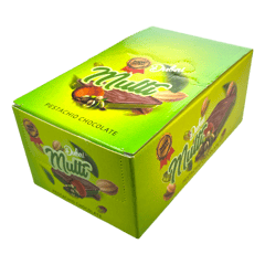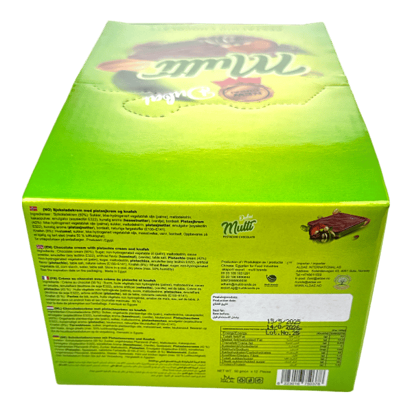 المكونات: سكر، زيوت نباتية، مسحوق كاكاو، فستق (١٠٪)، حليب خالي الدسم، مسحوق كنافة مصل اللبن، مستحلب (ليسيثين عباد الشمس)، منكهات، مضاد أكسدة.