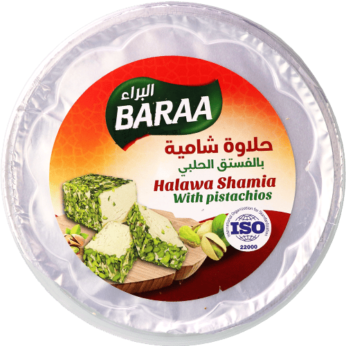 حلاوة طحينية بالفستق من البراء بعبوة عائلية 800غ، بطعم سمسم قوي وقطع فستق واضحة، مناسبة للفطور والتحلية والضيافة.