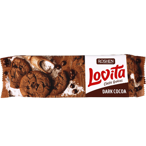 بسكويت مقرمش بنكهة الكاكاو الداكن من مجموعة لوفيتا من روشن، مخبوز مع قطع تغطية كاكاو وشوكولاتة ليمنحك طعم شوكولاتة مركز مثالي مع الشاي أو القهوة. المكونات الأساسية: دقيق قمح، سكر، دهن نباتي، قطع تغطية كاكاو (سكر، دهن نباتي، كاكاو منخفض الدسم، مستحلب ليسيثين الصويا، نكهة)، مسحوق كاكاو منخفض الدسم، حليب كامل الدسم بودرة، مواد رافعة، نكهات، ملح.