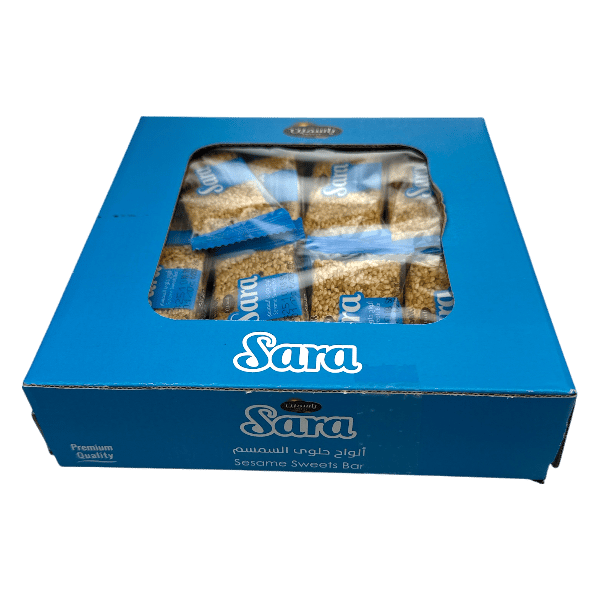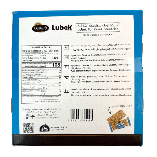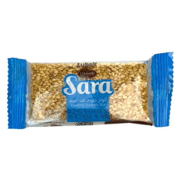 لوح حلوى مقرمشة من السمسم من ماركة سارة (لوبك). المكونات: سمسم، فستق، سكر، جلوكوز، حمض الستريك. يحتوي على مسببات الحساسية: السمسم والفستق.