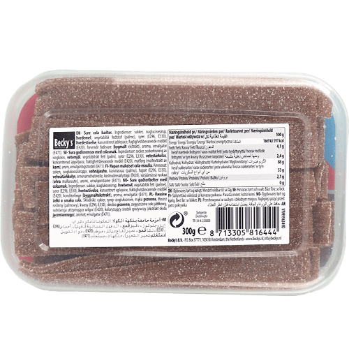 حلوى جيلي نباتية بنكهة الكولا الحامضة على شكل شرائط من بيكيز. حلال ومعتمدة بألوان طبيعية وطبقة حامضة لاذعة. قوام ممتع ومطاطي، مثالية لمحبي الحلويات الحامضة. المكونات الأساسية: شراب الجلوكوز، سكر، بديل الجيلاتين، حمض (حمض الستريك)، نكهات وألوان طبيعية.