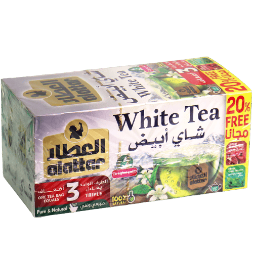شاي أبيض من العطار بأكياس شاي، طعمه خفيف وناعم ومناسب للشرب يومياً ساخن أو بارد.