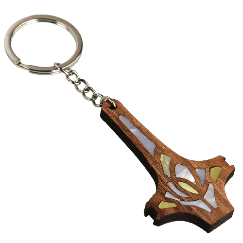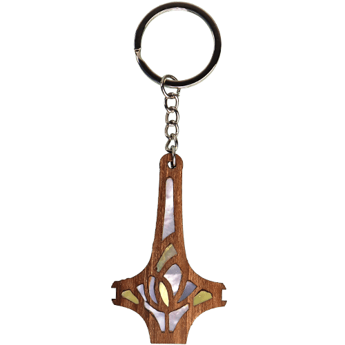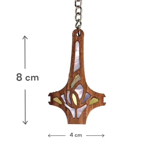ميدالية مفاتيح خشبية مطعّمة بالصدف الطبيعي (أم اللؤلؤ) بتطعيم يدوي يعطي لمعاناً مميزاً ومتانة جيدة مع الاستخدام اليومي.
