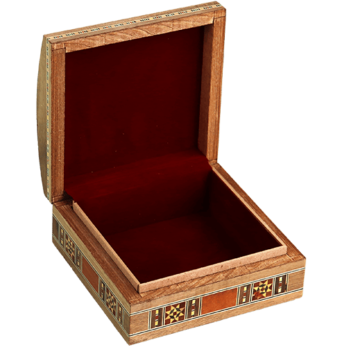 صندوق خشبي مزخرف بنقوش موزاييك شرقية مع غطاء مفصلي وبطانة داخلية ناعمة، مناسب لحفظ المجوهرات والإكسسوارات والهدايا الصغيرة؛ المقاس 14.5×14.5×6.5 سم.