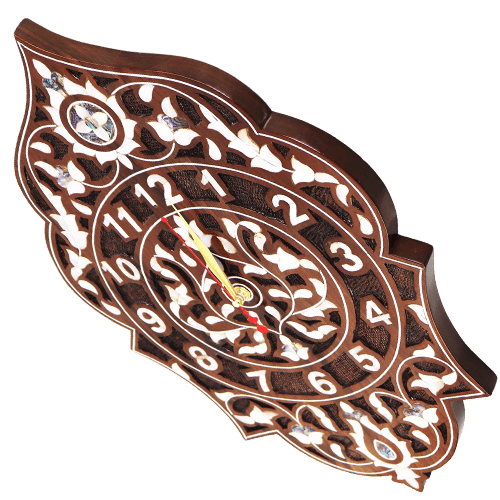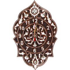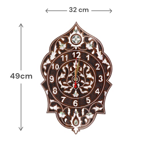 ساعة حائط خشبية مطعّمة بالصدف الطبيعي بتصميم شرقي مزخرف وأرقام واضحة. المقاس 32×49 سم ومناسبة كقطعة ديكور للصالون أو المدخل أو المكتب.