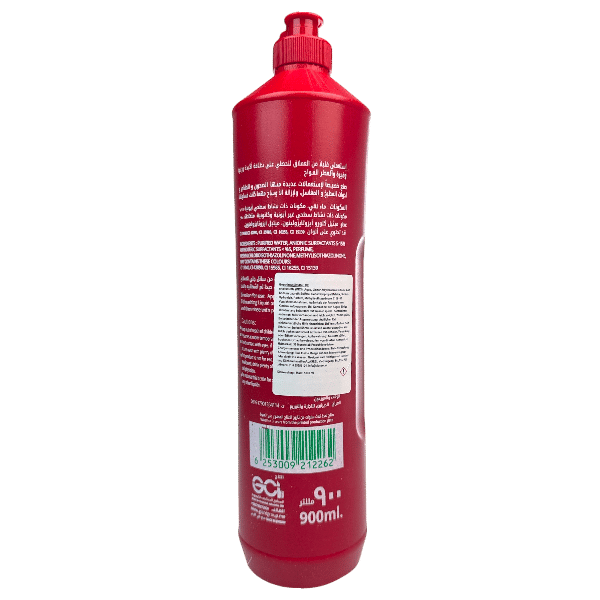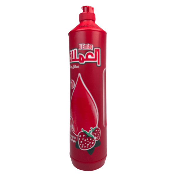 سائل جلي من ماركة عملاق برائحة الفراولة، فعال في تنظيف وإزالة الدهون من الصحون. المكونات الأساسية: مواد أنيونية فعالة للسطح، مواد غير أنيونية، عطر الفراولة، ماء، ملونات.