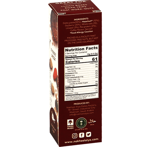 وجبة خفيفة صحية مكونة من عجينة التمر (25٪)، زبدة البندق (10٪)، توت غوجي (10٪)، شوفان كامل، زيت جوز الهند، بروتين عدس. غنية بالألياف والبروتين، طبيعية وخالية من المواد الصناعية. مثالية للمدرسة أو بعد التمارين