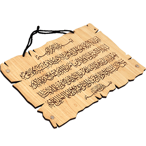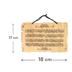 لوحة خشبية صغيرة مزخرفة بنقش آية الكرسي بالخط العربي، مقاس تقريبي 18×17 سم، مناسبة لتعليقها أو وضعها على الرف أو المكتب، وتضفي أجواء روحانية على المكان.