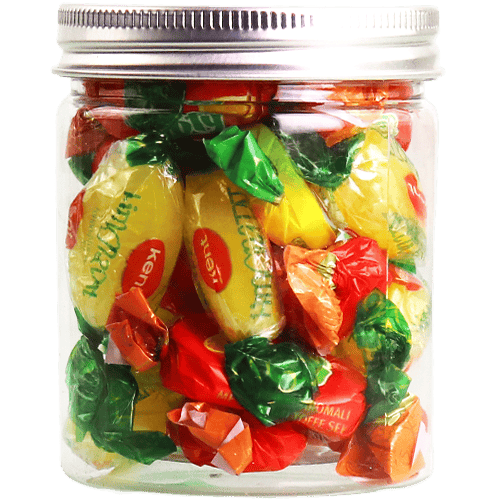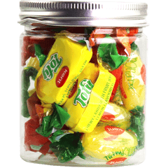 علبة شفافة مع غطاء معدني مليئة ببونبون مشكل بنكهات فواكه وكَرَميل مثالية للتقديم للضيوف أو كهدية بسيطة. أفضل استخداماتها للتقديم مع القهوة والشاي، وضعها في مكتب العمل للزملاء، وضعها في غرفة الجلوس للضيوف، توزيعها في أعياد الميلاد للأطفال، أو استخدامها كهدية صغيرة في المناسبات. من أكثر الأسئلة الشائعة: ما هي النكهات؟ عادة فواكه مختلفة وكَرَميل. هل العلبة قابلة لإعادة الاستخدام؟ نعم يمكن تعبئتها بحلويات أخرى. هل تناسب الأطفال؟ نعم لكن يفضل بإشراف الكبار. كيف أحفظها؟ في مكان جاف بعيد عن الحرارة.
