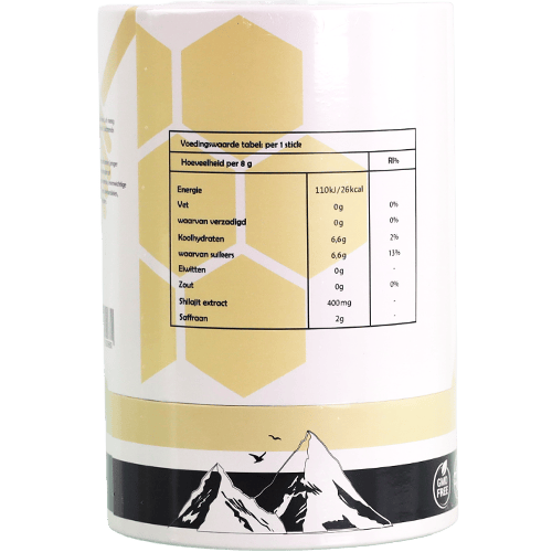 المكونات الأساسية: مستخلص شيلجيت الهيمالايا، عسل نقي، زعفران (حسب ما هو موضح على العبوة وتركيبات مشابهة).